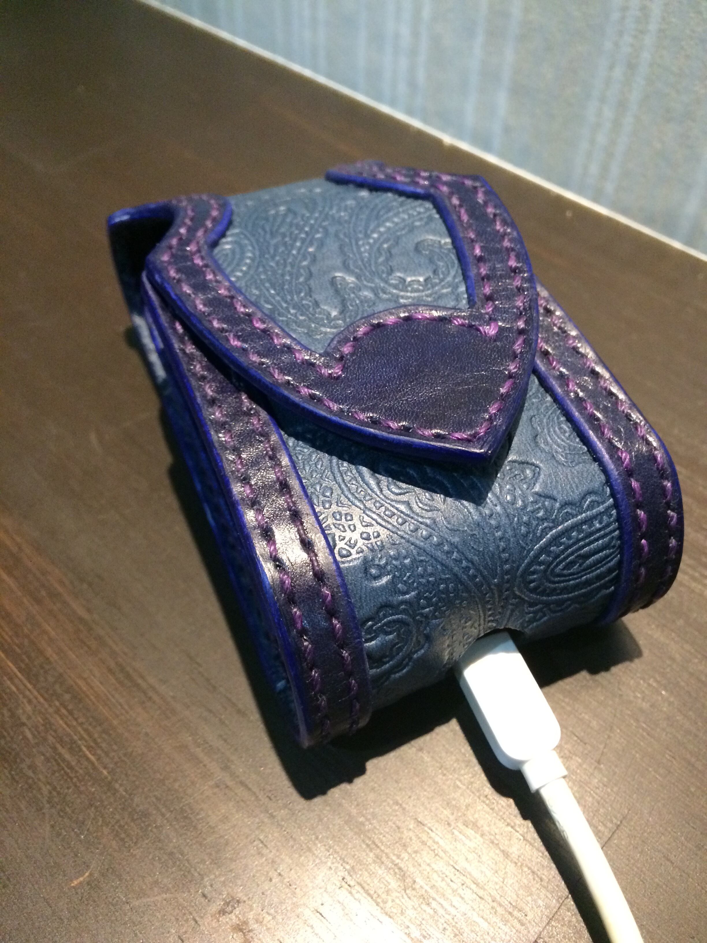 革にペイズリー柄が型押しされ綺麗な青で染め上げた革で製作しました。